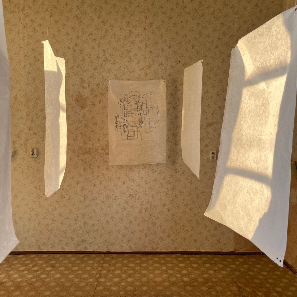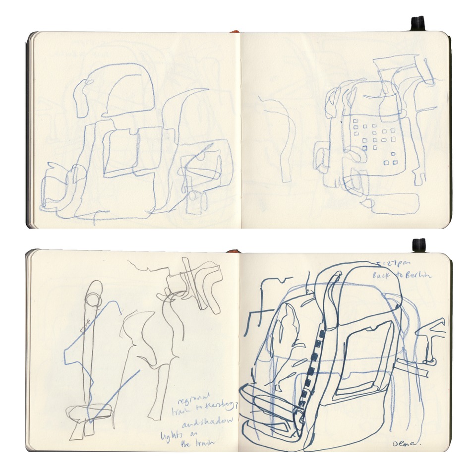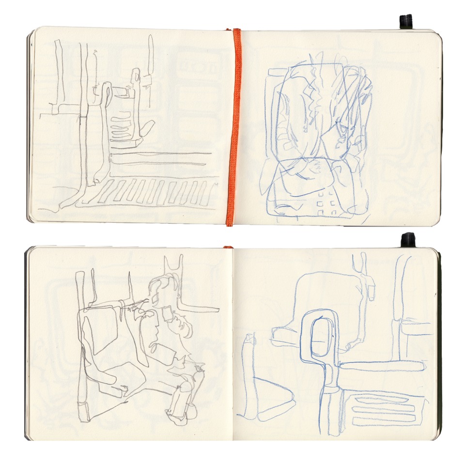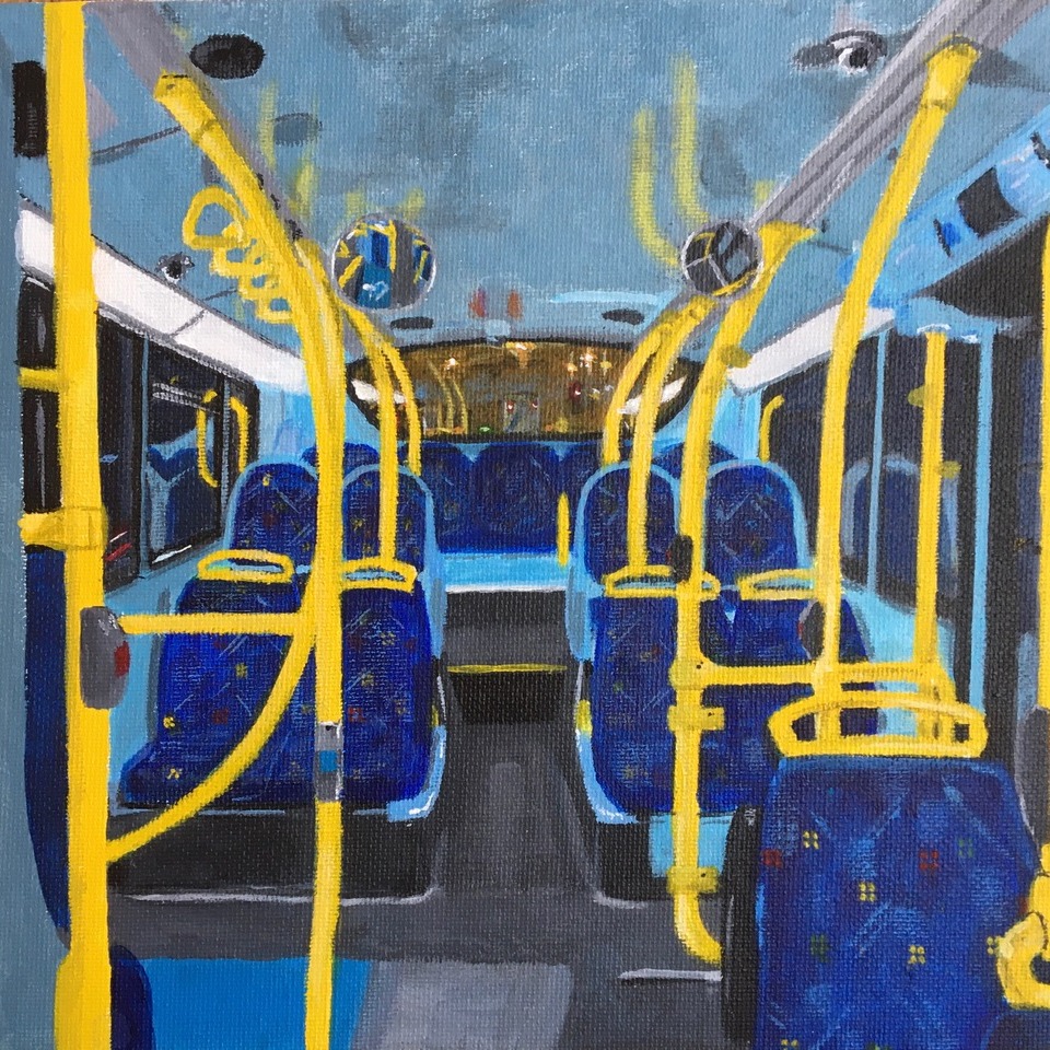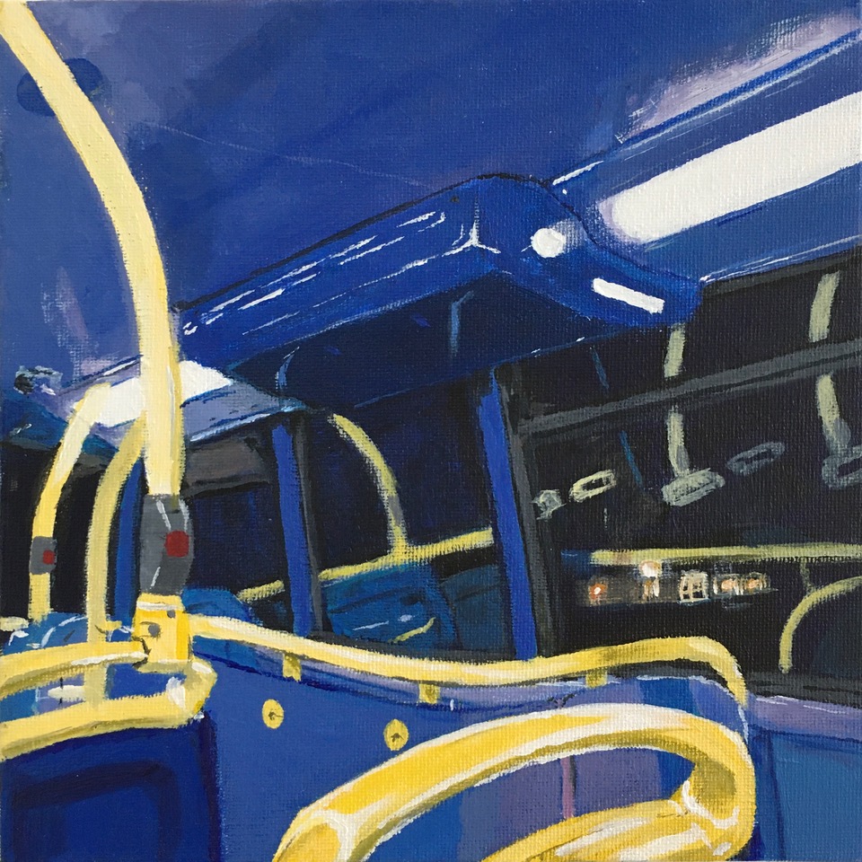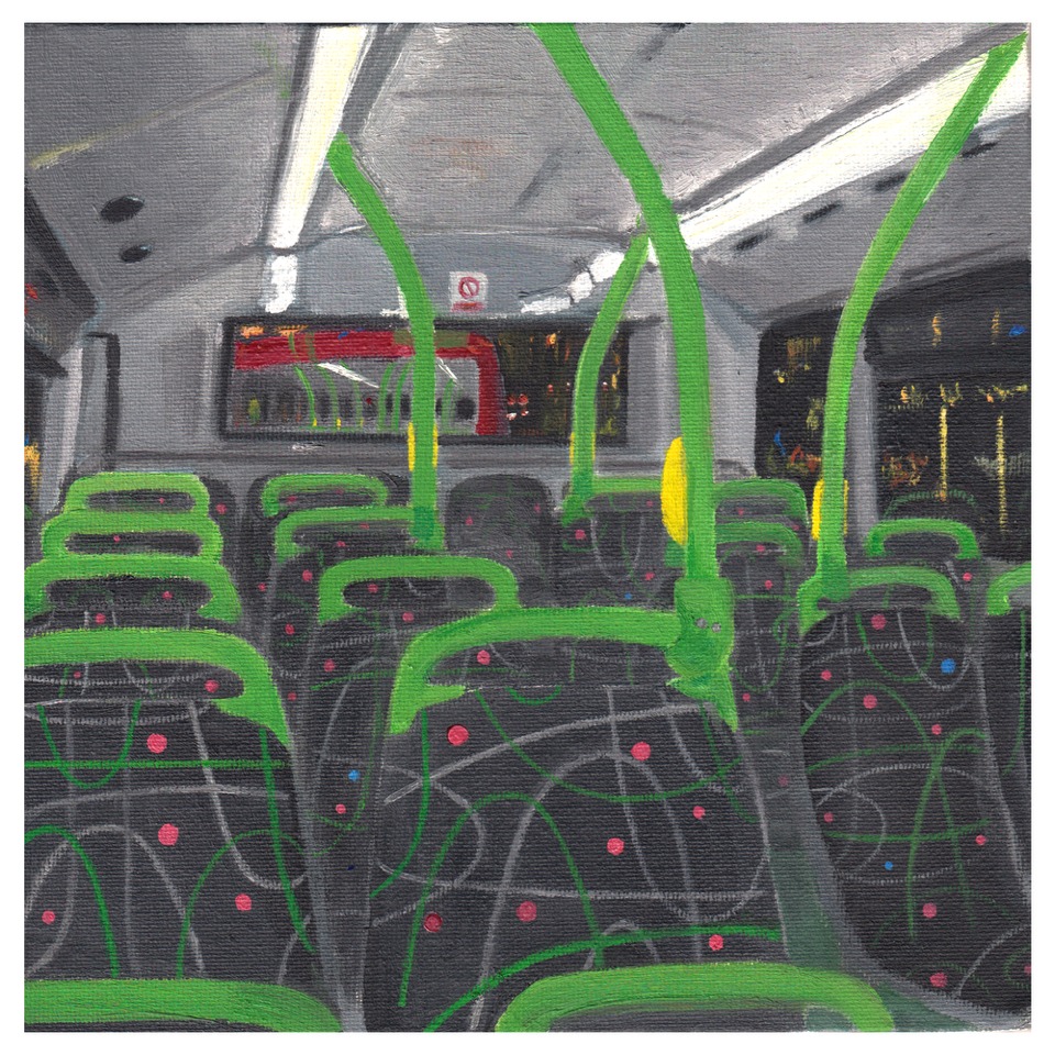 Her work – such as, her ‘Night Bus’ paintings – explores themes of liminal spaces within public transport interiors, and the alien atmosphere that these spaces can often evoke. Furthermore, through playful drawing methods such as continuous line or blind drawing, she sketches ordinary scenes from life and explores themes of lines, layers and reflections.
