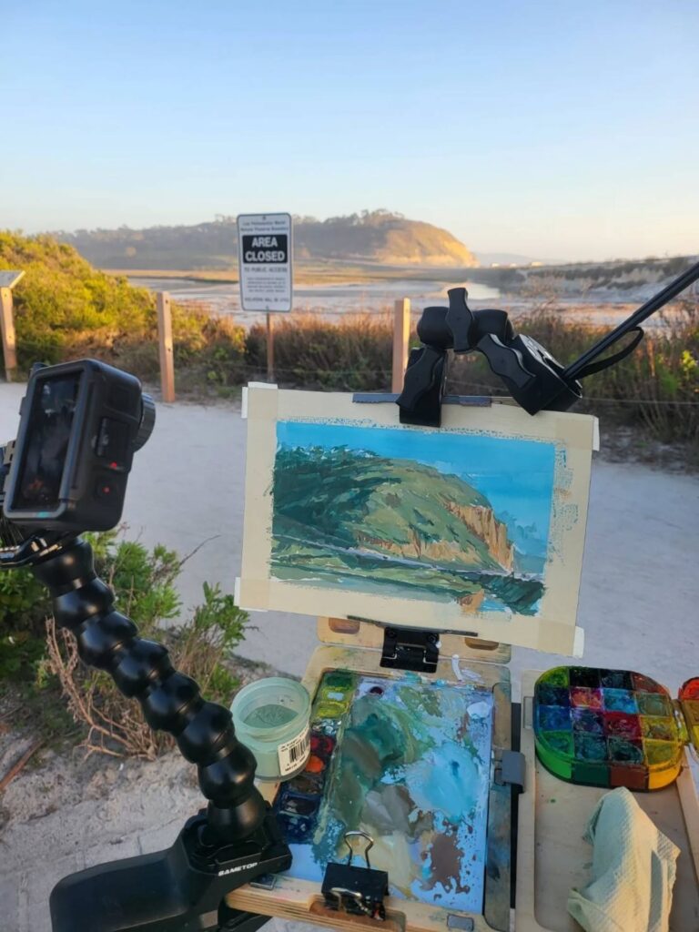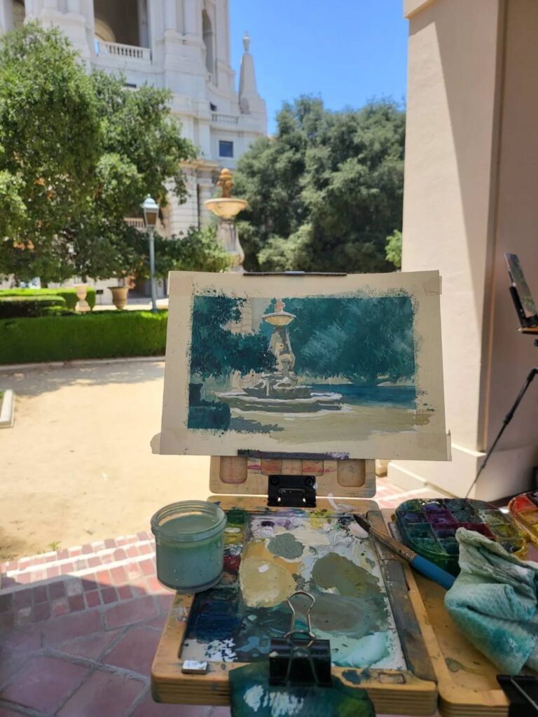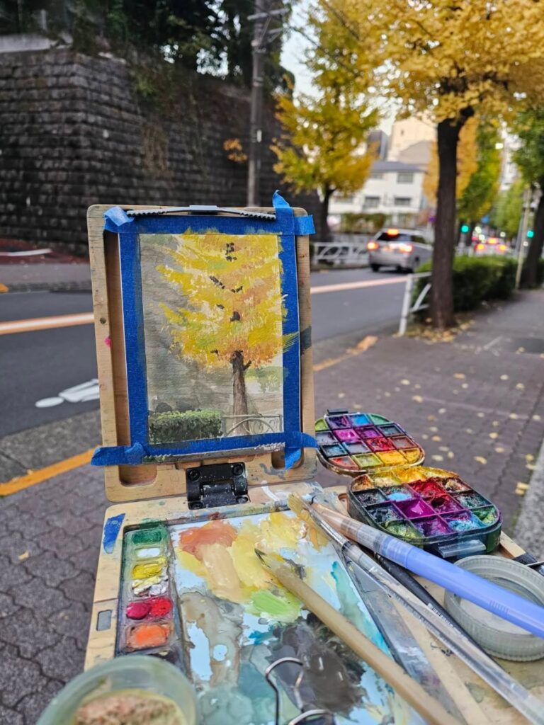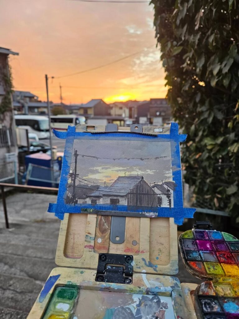 制作活動の深化と、自然や旅への探究心を満たすため、リデルは主にゴアッシュを用いたプレーンエア・ペインティング(屋外制作)を行っています。ゴアッシュは水彩に似ていますが、より不透明で扱いやすい特徴を持ちます。この1〜2時間ほどの集中した屋外制作は、彼の色彩感覚や雰囲気表現に強く影響しています。家族の集まりの後に散らかった器やカップ、静かな川面に映る空など、日常のあらゆる場所に潜む美を見つけることを大切にしています。