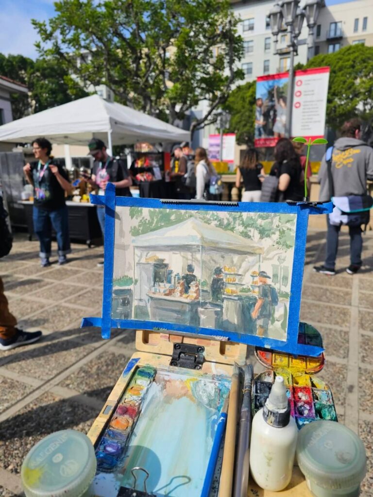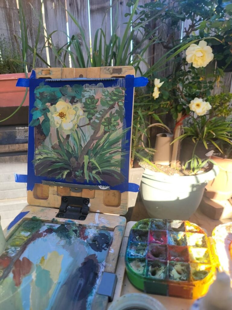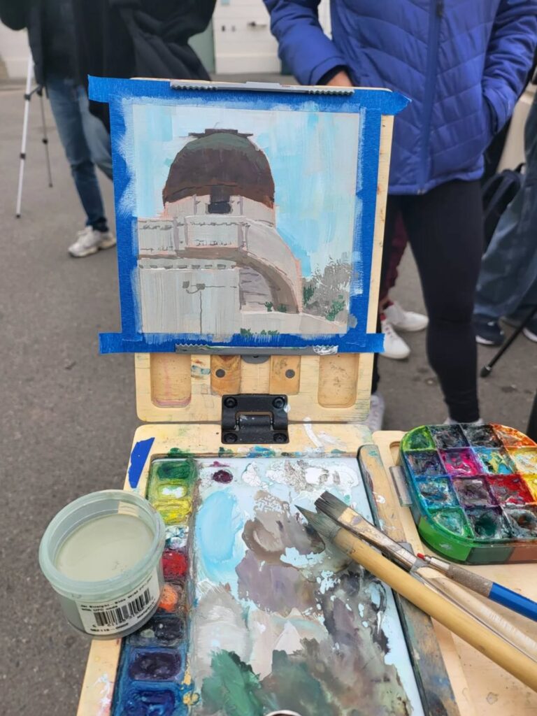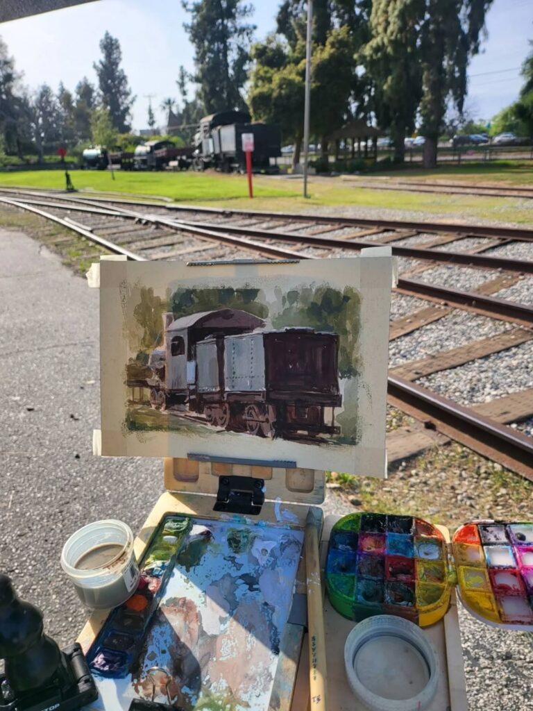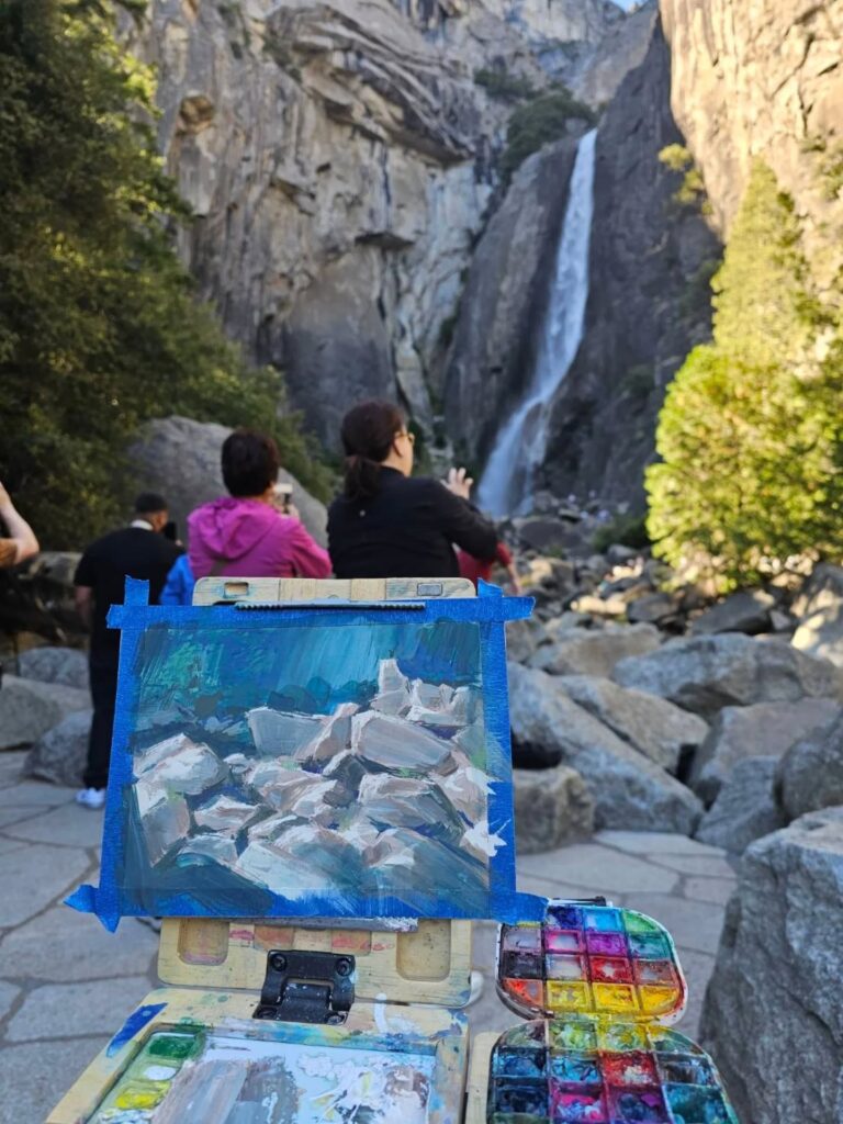 制作活動の深化と、自然や旅への探究心を満たすため、リデルは主にゴアッシュを用いたプレーンエア・ペインティング(屋外制作)を行っています。ゴアッシュは水彩に似ていますが、より不透明で扱いやすい特徴を持ちます。この1〜2時間ほどの集中した屋外制作は、彼の色彩感覚や雰囲気表現に強く影響しています。家族の集まりの後に散らかった器やカップ、静かな川面に映る空など、日常のあらゆる場所に潜む美を見つけることを大切にしています。